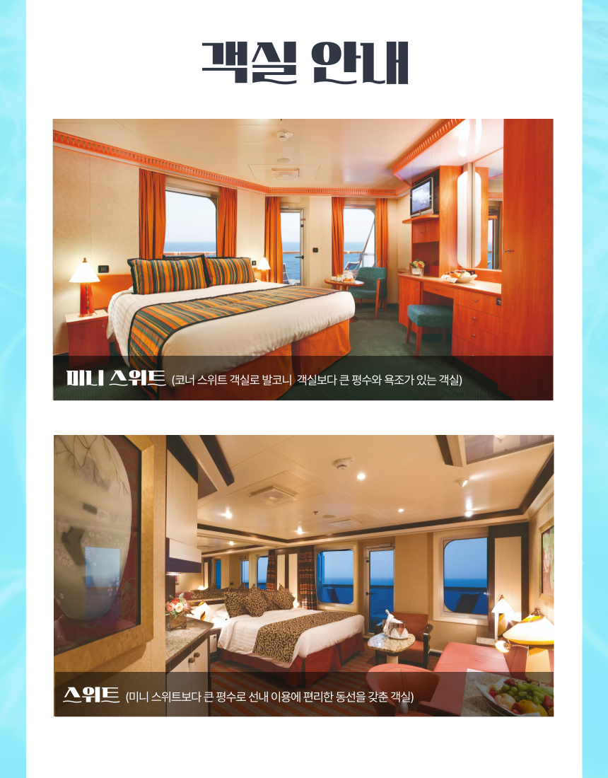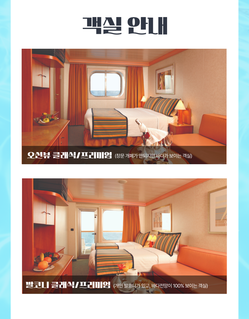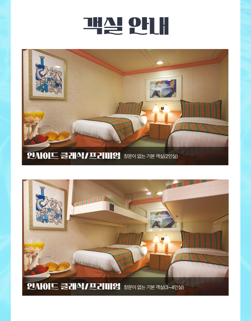 ✔️ 소아, 유아 상품가는 성인 2인과 함께 캐빈을 사용하는 기준입니다. 성인 1명, 소아 1명이 한 캐빈을 사용할 경우, 소아도 성인요금 부과